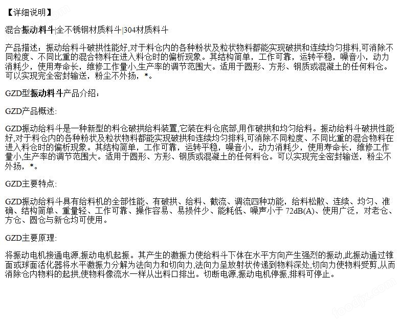 將振動(dòng)由機(jī)接通由源攝動(dòng)由機(jī)起振。且產(chǎn)生的激振力使給料斗下體在水平方向產(chǎn)生強(qiáng)列的振動(dòng)此振動(dòng)通過錐面或球面活化器將水平激振力分解為法向力和切向力法向力呈放射狀傳遞到物料深處切向力使物料受剪從而消除倉(cāng)內(nèi)物料的起拱使物料像流水一樣從出料口排出。切斷電源振動(dòng)電機(jī)停振排料可停止。