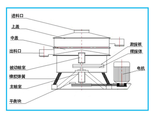 即可調(diào)節(jié)偏心距的激振器產(chǎn)生了非線性三維運動,物料也產(chǎn)生同樣的近似手動作業(yè)的運動,從而達(dá)到篩分之目的,