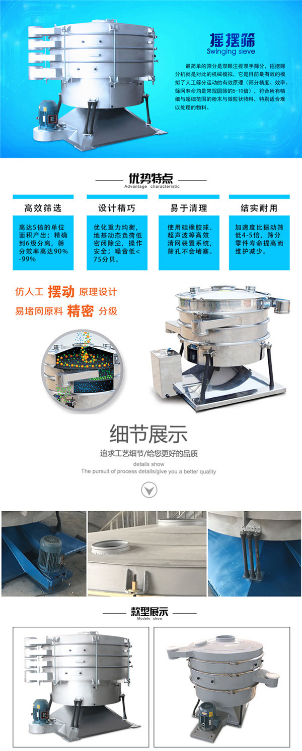 即可調(diào)節(jié)偏心距的激振器產(chǎn)生了非線性三維運動,物料也產(chǎn)生同樣的近似手動作業(yè)的運動,從而達(dá)到篩分之目的,再配合篩分附件可得到更加理想的篩分效果;適合于圓球狀、圓柱狀、片狀、乃至不規(guī)則形狀易堵網(wǎng)且需要精密篩分的物料。