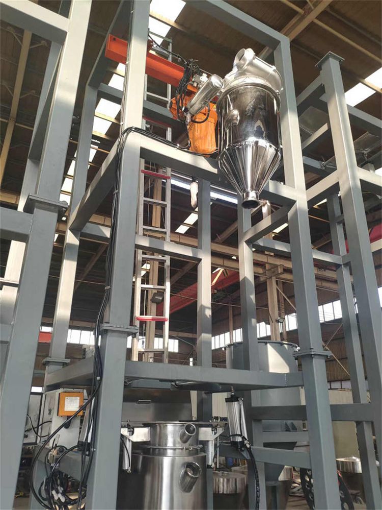 噸包投料站又稱噸袋拆包機,是用來實現(xiàn)袋裝散裝物料的卸料功能,為半自動操作。包裝袋由電動葫蘆提升,包裝袋的袋繩掛在鋼性支架上,手動操作控制葫蘆升降和行走,沿著行走導軌運行到卸料區(qū)上方落下,將包裝袋放置在支架托盤上,使大袋處于卸料位置。然后手動打開卸料閥操作門,人工將包裝袋的卸料口拉入到卸料閥的系口出,按下系帶按鈕,卸料閥束緊氣缸將袋口鎖緊,再手動將大袋的卸料口從卸料位置拉下,罩在卸料口密封箱內(nèi)的出料管外側(cè),按下壓袋機構(gòu)氣動控制開關(guān),使密封法蘭下降,并緊壓在出料管的管端,密封卸料通道,以防卸料過程中粉塵漏,接著,人工解袋,關(guān)上操作門。手動開啟與卸料口密封箱連接的通風除塵管道上的閥門。至此,卸料準備過程結(jié)束。