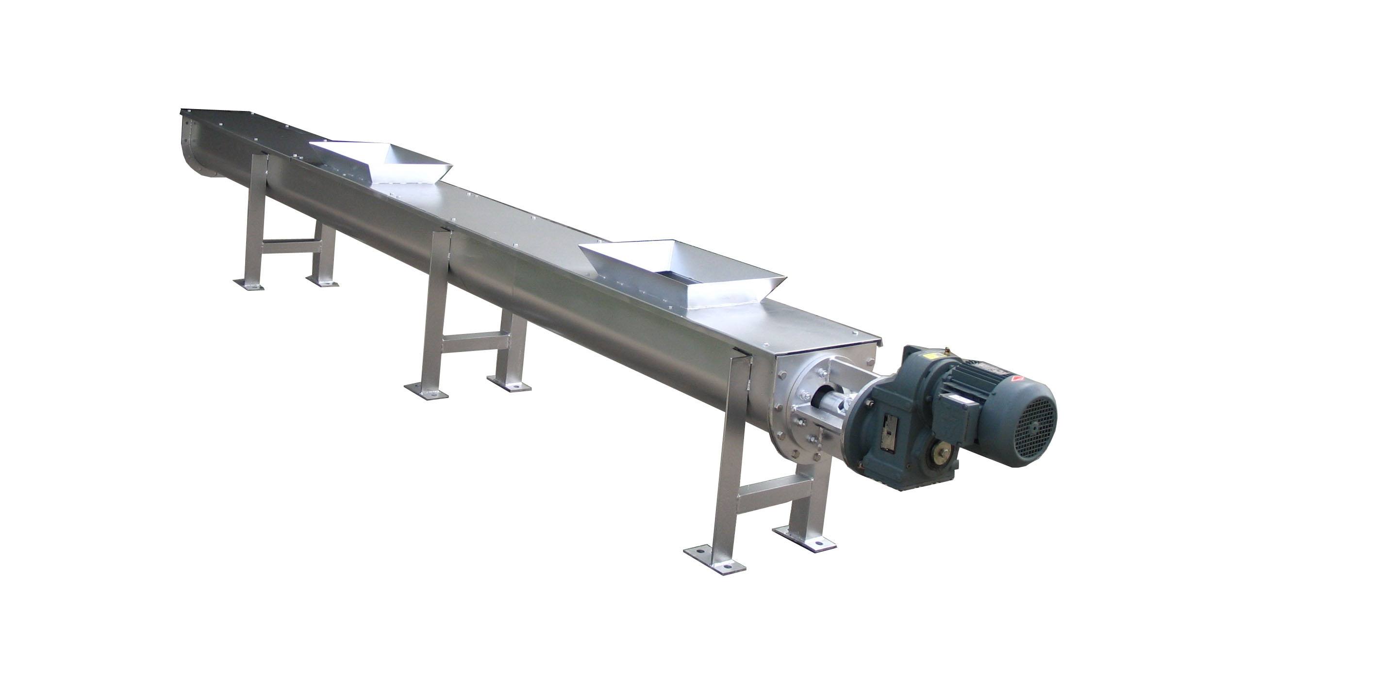LS型螺旋輸送機結(jié)構(gòu)特征,一臺螺旋輸送機通常由本體、進出裝置、驅(qū)動裝置三大部分組成。本體由首節(jié)、中間節(jié)、尾節(jié)三種組成。在首節(jié)內(nèi)裝有支推軸承承受軸向力,在中間節(jié)和尾節(jié)內(nèi)裝有用軸承支承螺旋軸,此外,在尾節(jié)內(nèi)還裝有可軸向移動的徑向軸承以補償螺旋軸長度的誤差和適應(yīng)溫度的變化。各螺旋軸之間采用法蘭式聯(lián)接,提高聯(lián)接軸的互換性,便于維修。
