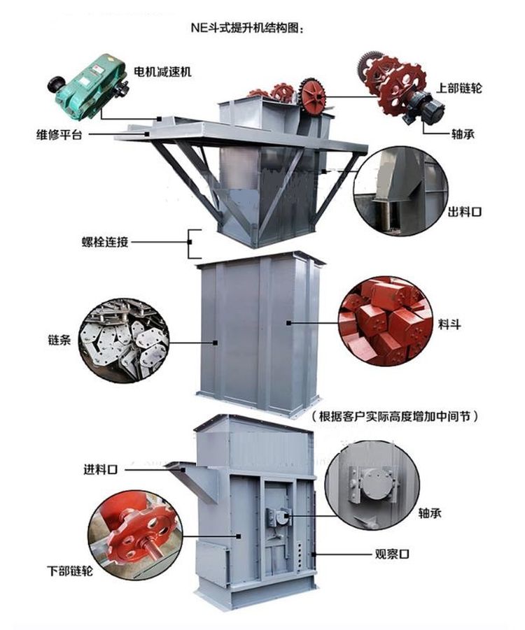 NE系列板鏈斗式提升機由運行部件、驅(qū)動裝置、上部裝置、中部機殼、下部裝置組成。