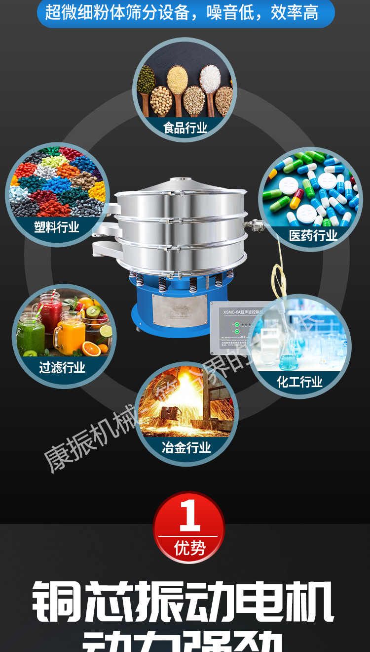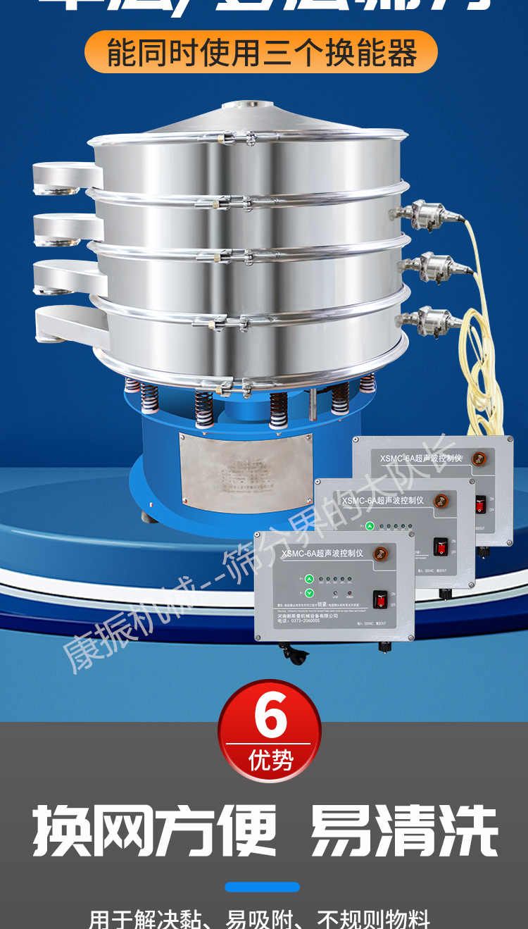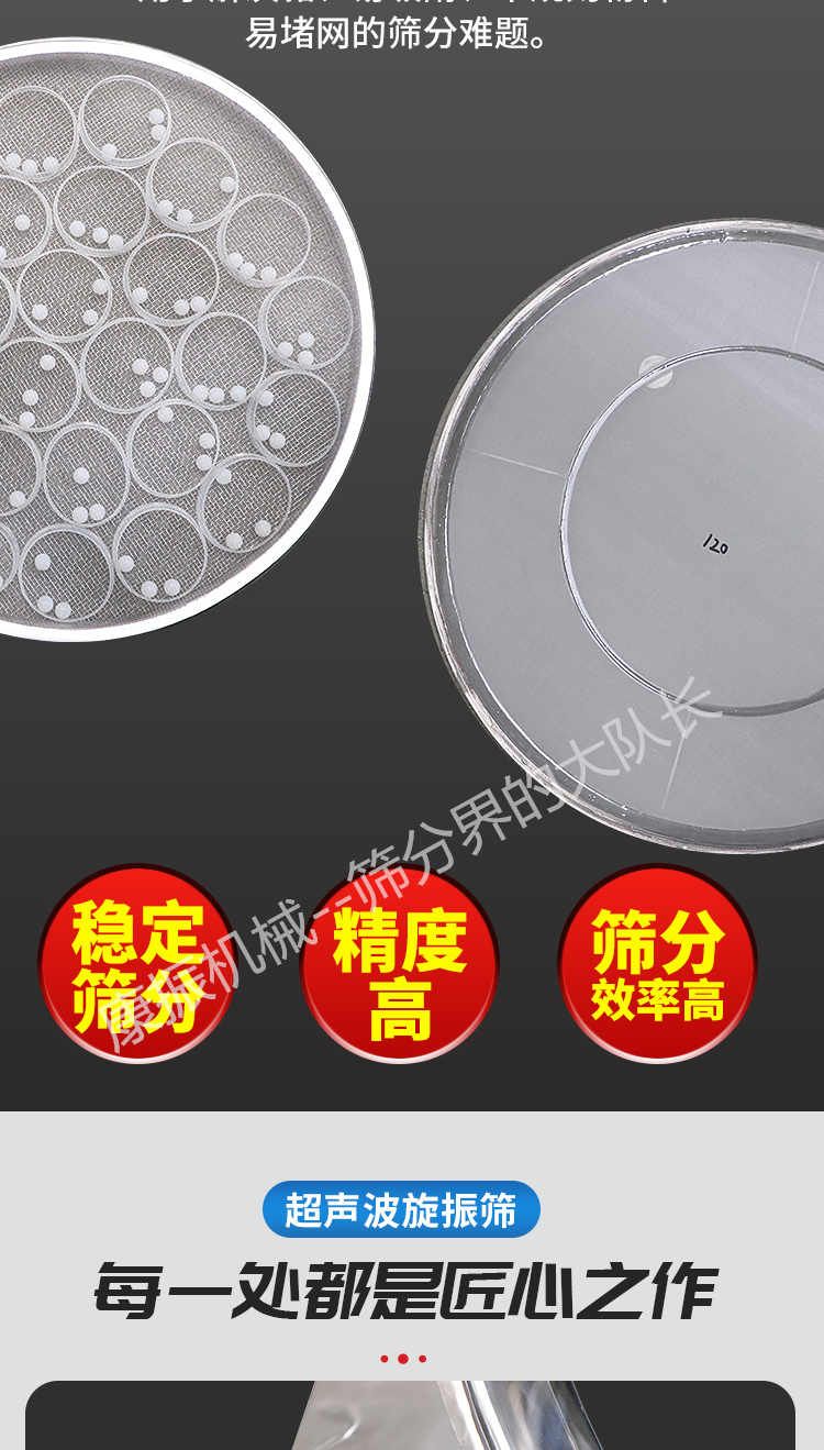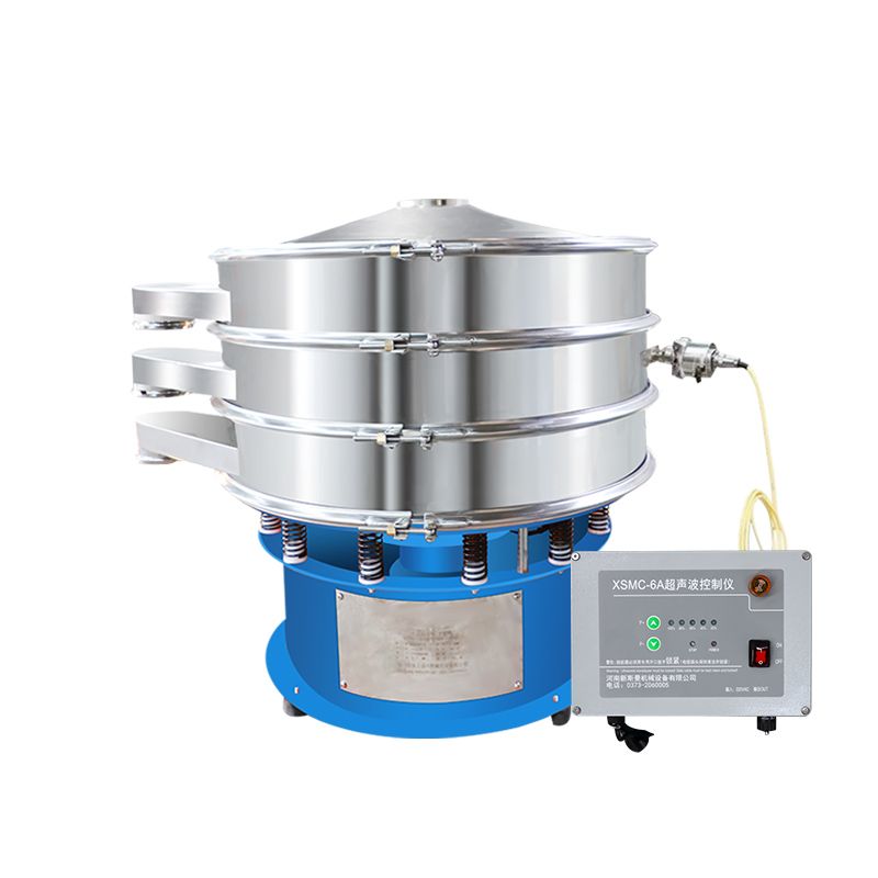 超聲波振動(dòng)篩是在旋振篩的基礎(chǔ)上引入了超聲波清網(wǎng)裝置,通過將220V、50Hz或110V、60Hz電能轉(zhuǎn)化為18KHz的高頻電能,輸入超聲換能器,將其變成18KHz機(jī)械振動(dòng),從而達(dá)到高篩分和迅速清網(wǎng)的目的,使超微細(xì)粉篩分成為易事。該系統(tǒng)在傳統(tǒng)的振動(dòng)篩基礎(chǔ)上在篩網(wǎng)上引入一個(gè)低振幅、高頻率的超聲振動(dòng)波(機(jī)械波),以改善超微細(xì)粉體的篩分性能。特別適合高附加值精細(xì)粉體的用戶使用。超聲波篩分系統(tǒng)是一種簡(jiǎn)單實(shí)用、可靠的篩分系統(tǒng),是當(dāng)前網(wǎng)孔堵塞的有效的解決方法。可廣泛應(yīng)用于制藥、冶金、化工、選礦、食品等要求精細(xì)篩分過濾的行業(yè),篩分過濾精度高,有效解決因團(tuán)聚、靜電、強(qiáng)吸附性卡堵網(wǎng)孔等篩分難題,是國內(nèi)篩分行業(yè)的一項(xiàng)重大技術(shù)突破。