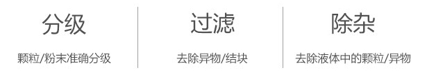 任何顆粒、粉末、粘液一定范圍內(nèi)均可篩選。篩分細(xì)至500目或0.028mm, 過濾小可至5微米。分級篩選,可篩一至五層篩網(wǎng),能同時進行二至六個等級的分選或過濾。