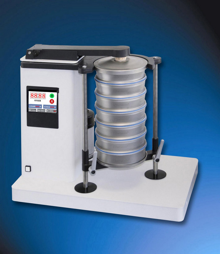 電機(jī)帶動(dòng)齒輪通過同步帶傳動(dòng)到主軸上,經(jīng)齒輪變速后主軸按要求的轉(zhuǎn)速轉(zhuǎn)動(dòng),主軸帶動(dòng)偏心輪使滑板做往復(fù)運(yùn)動(dòng),帶動(dòng)安裝在滑板托盤中的試驗(yàn)篩左右搖動(dòng),同時(shí)主軸帶動(dòng)頂桿齒輪轉(zhuǎn)動(dòng),變速后頂桿齒輪通過凸輪頂擊頂桿,頂桿使拍錘上下拍擊試驗(yàn)篩上蓋,使得試驗(yàn)篩、分樣篩中的物料往復(fù)和上下振動(dòng),使小于試驗(yàn)篩的篩面網(wǎng)孔的物料顆粒篩分進(jìn)下層試驗(yàn)篩,如此層層篩選,使每層試驗(yàn)篩內(nèi)只留相同粒度的物料。達(dá)到不同粒度的分離并確定此物料的粒度組成。