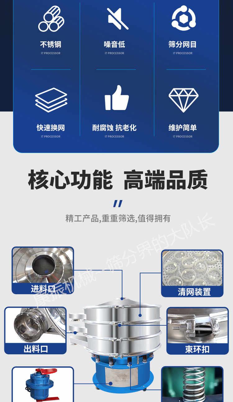 2、去液體:本設(shè)備單層、多層使用,可十分有效地處理固體、液體的混合物料??焖賹?shí)現(xiàn)固液分離,并篩選過(guò)濾出不同的目的物料。